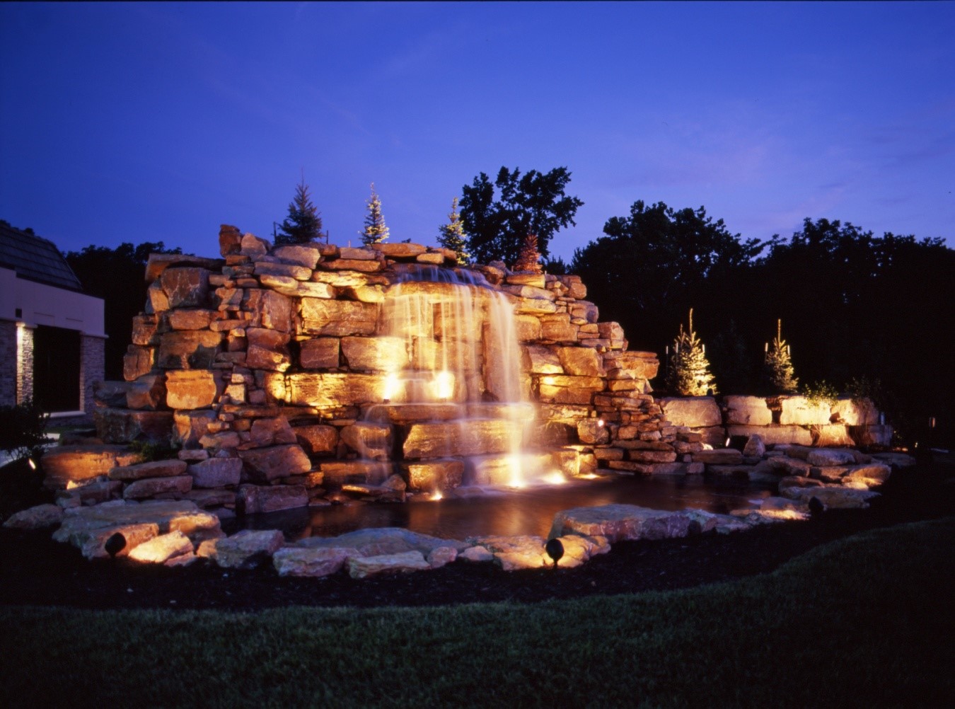 In the picture below, you’ll notice the bunch of trees in the foreground of the picture. The owners wanted to highlight the trees in the yard as well as the trees and shrubs close to the house. Our outdoor lighting design specialist works with you to come up with the best lighting for your home and garden.