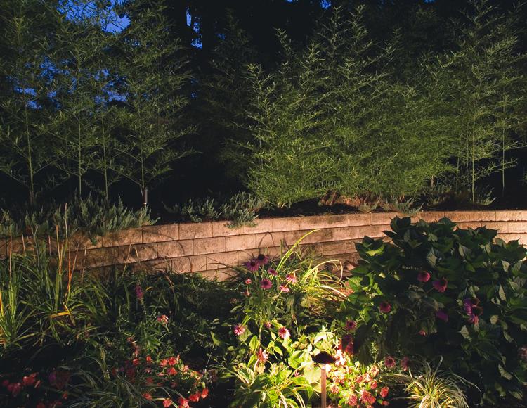 In the picture below, you see path lighting integrated into the garden and shrubs lining the hardscape accent wall. Notice how you can see the colors of the flowers as well as being able to clearly see the retaining wall.