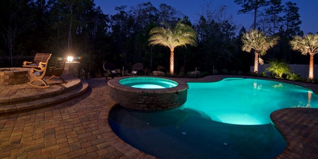 Don’t let the night take away welcome time in the pool. Outdoor Lighting Perspectives® will help you enjoy your pool or hot tub no matter the time of day while increasing safety with the right amount of lighting. Our professional designers will consider your property before designing the perfect layout for your pool, which is available in a variety of colors.
