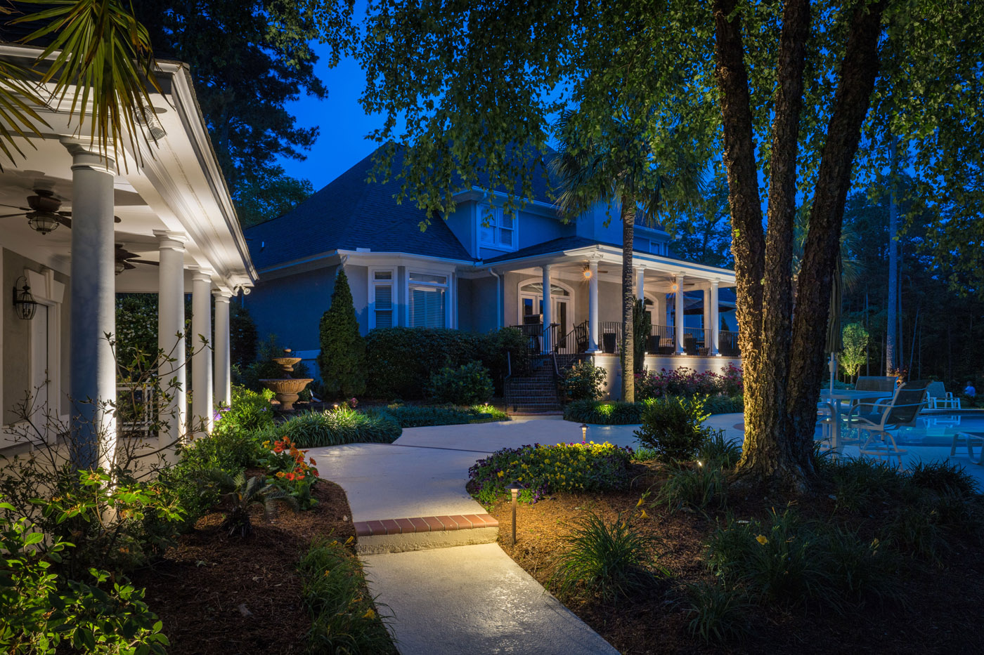 Flower beds, shrubbery, and landscaping are a perfect focus for illuminating your property at night. While we do offer focal lighting for the most precious items such as trees and statues, we often use soft path lighting for a general glow among your landscaping. When you trim your yard with luscious tropical plants and flowers, it is unrealistic to shine a bright light on all or to choose a favorite. With the use of beautifully designed lighting, all of your vegetation gets noticed.