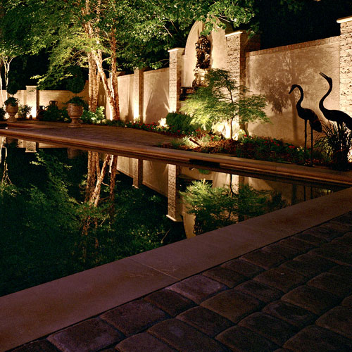 After all of the functional lighting is completed, the next thing to consider is illuminating the adjoining structures. Take a look at the fence wall below. The homeowners chose this wall as a natural fence. During the day, the beauty of the wall is part of their pool-area enjoyment. That doesn’t have to be sacrificed at night.