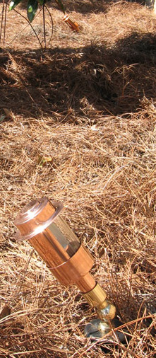 What’s interesting is study this picture further to find the other identical fixture in the picture. If this fixture wasn’t so far in the foreground of this photo, we’d likely have a hard time seeing it also. The copper does happen to blend beautifully with the popular pinestraw landscaping material.